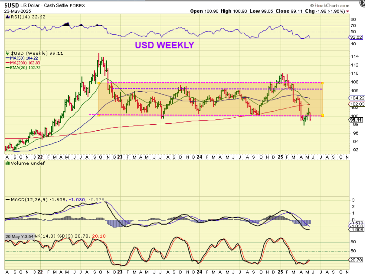 SILVER is just a mess on this weekly chart, really. I did point out the similarity between Silvers crash down on April 7 and Platinum’s crash down on April 7. Platinum bounced back like Silver, it chopped sideways like Silver here, but Platinum took off higher, so Silver COULD do that same thing. I’ll re-post those 2 charts again in this report next…