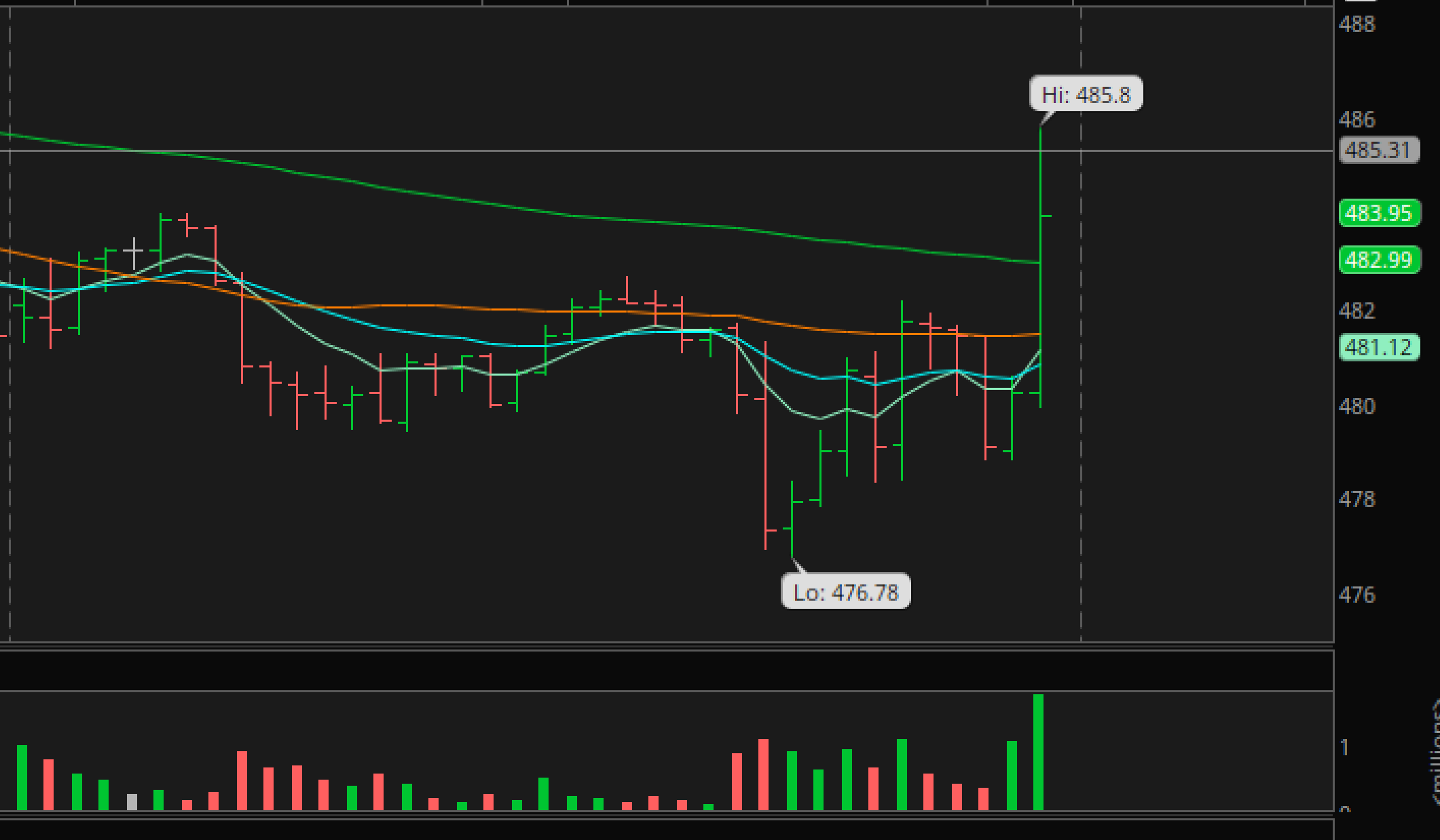 QQQ – Next the markets climbed back up, chopped, dropped, popped, and then surged higher. You can see that IF YOU SHORTED THAT FIRST DROP, you’d get hurt. I try to show my readers that the initial reaction can be ‘knee jerk’ false moves for that very reason. QQQ closed at $483 (right here).