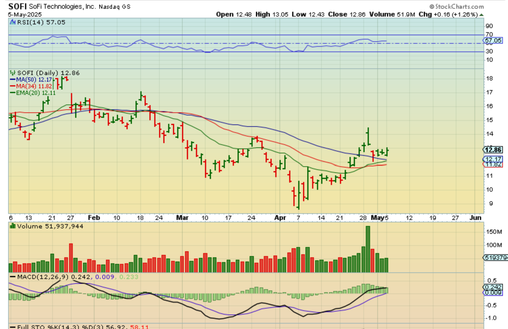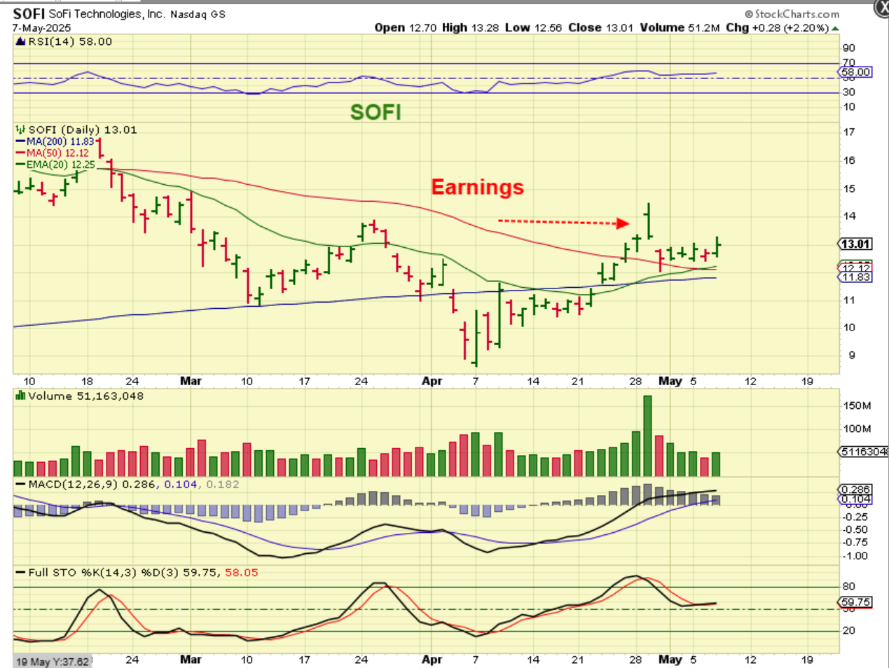 SOFI was actually mentioned 2 days ago here, and then 2nd chart is after the Fed. It is bullishly crawling along the moving averages. SOFI ran from $6 to $18.50 last summer into fall.