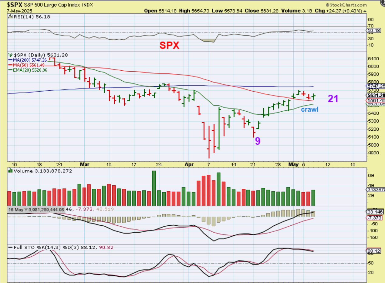 SPX – The SPX did that same drop and surge, but on a daily chart you just don’t see it. Instead, just as expected, we have ‘ crawled’ along the 50sma (or under the 200sma) and it looks like totally normal price action for day 21. We have a day 18 ‘peak’, so a push above that makes this lean toward a R.T. daily out of an ICL, which I have been calling this anyway. BUY & HOLD Stops have not been hit and can be raised to $5520.