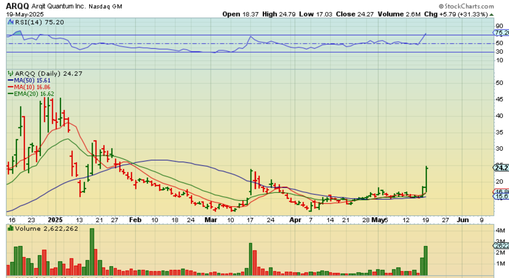 ARQQ– also at 10:30 I saw ARQQ adding another good day (it popped Friday after riding the 50sma). This closed up 31%!!