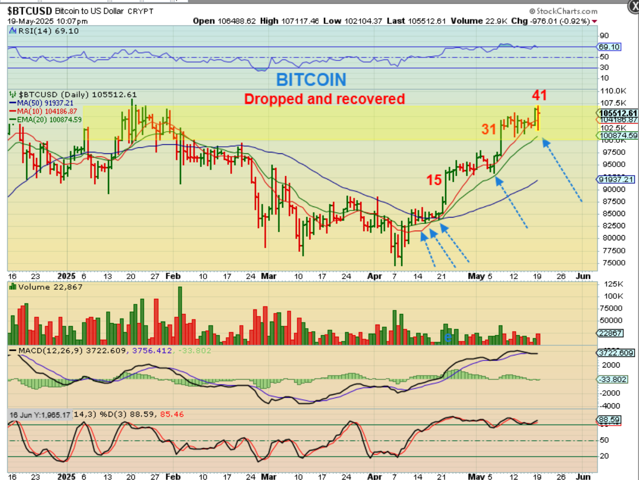 BITCOIN dropped yesterday and then tried to recover (surprises to the upside). At day 41 and being back at the highs or resistance, I mentioned in the weekend report that Bitcoin could start to find resistance, chop sideways, and even dip to put a handle on the cup, but it does also have time to break out first and then back-test as a dcl, so we shall see. ALSO, even if …