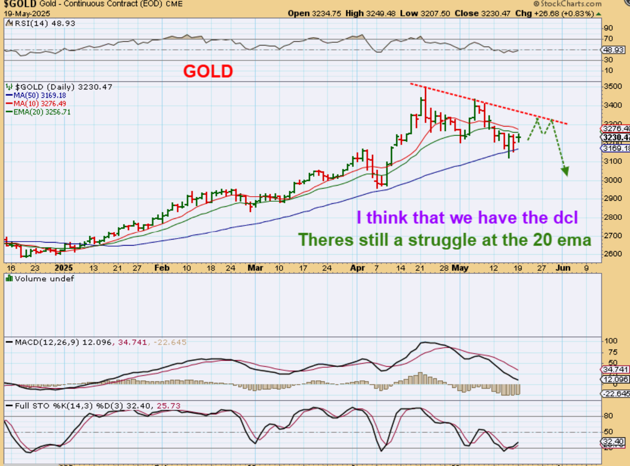 GOLD was expected to run to the downtrend line out of a dcl, and then drift lower to a possible ICL. Gold is struggling at the 20 ema so far. Let me grab a live shot…
