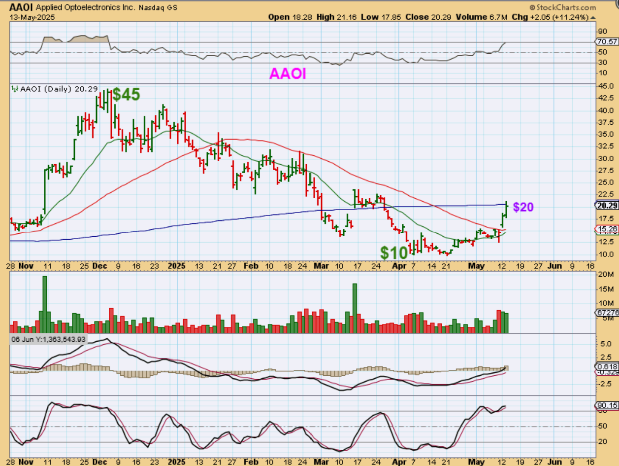 I actually took a look at AAOI last week and thought that it was too laggy at the green 20 ema, so maybe too lagging too much to buy yet. It was near $12.50. Suddenly it ran from $10 to $20! 100% since April 21.