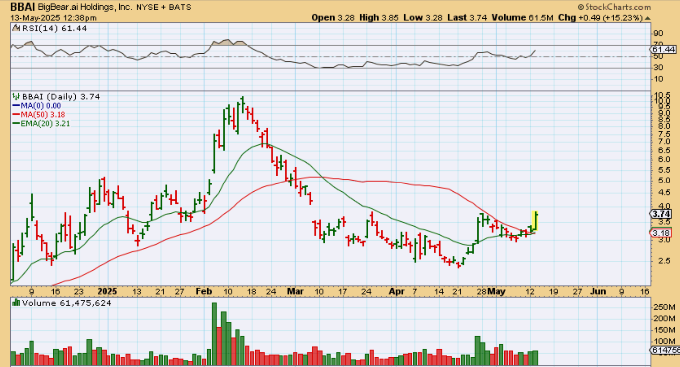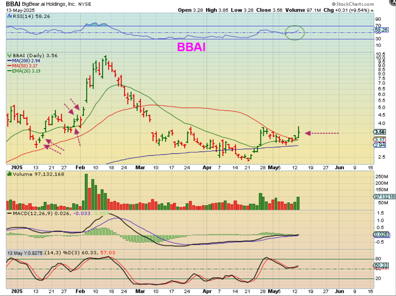 BBAI closed up roughly 10%, after being up 20%. Does that worry me? No, I would add on dips and look at my Maroon arrows. Those were days that ran up and pulled back by the close. Did that end the run? Not at all. That pop and pullback happened on many days in January & February, but it still tripled. I still like this set up for the long run.