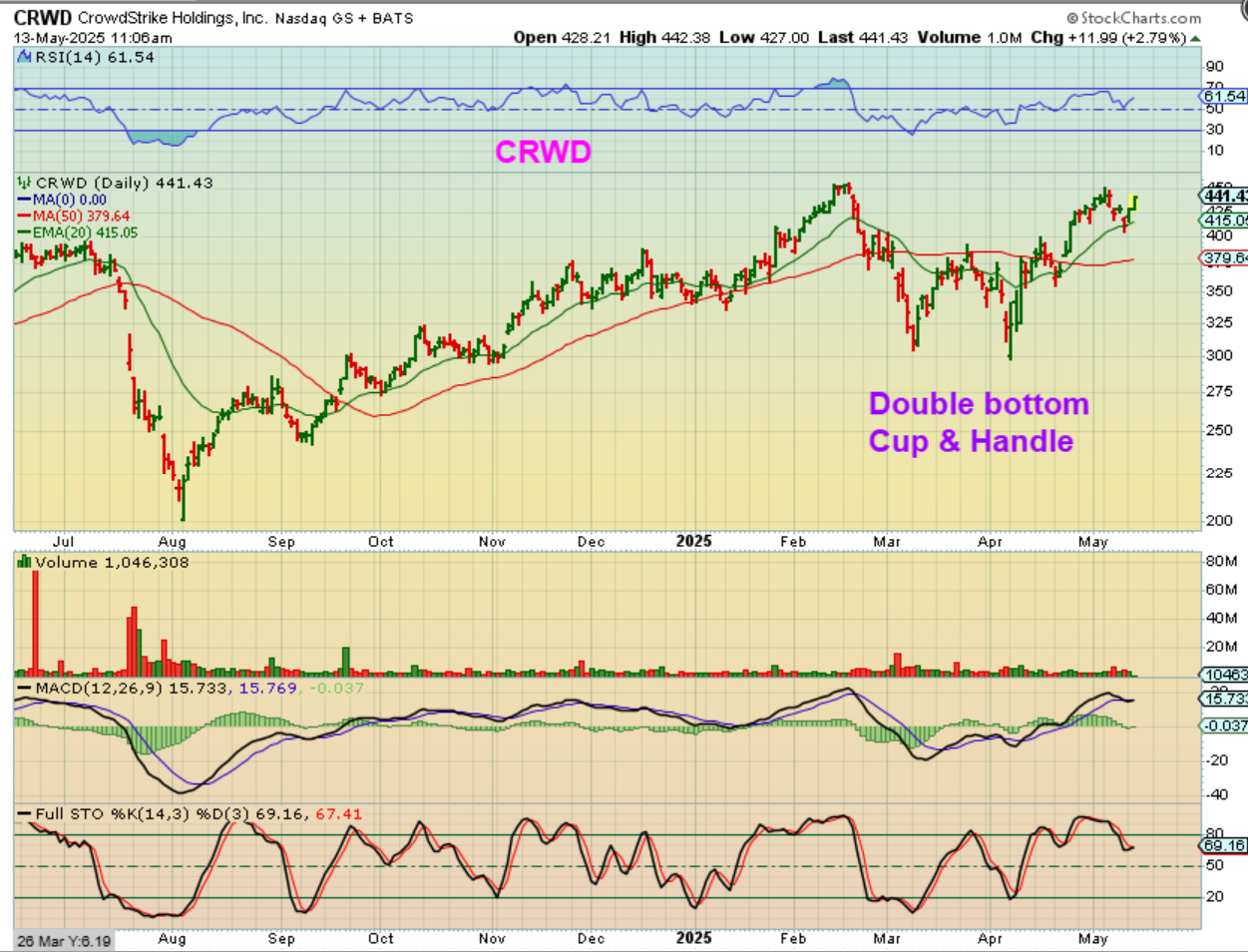 I used to love CRWD (Crowdstrike) and they dropped when a negative report came out. I believe it was one of those ‘Hindenburg’ reports. Seems it wasn’t entirely true and now we have a ‘double bottom low’ after that recent ICL crash and CRWD is already back to former highs. This is a nice double bottom cup and handle.