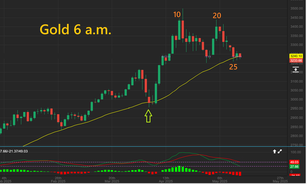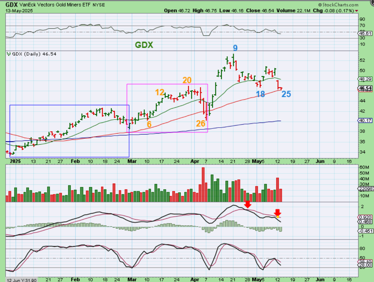GOLD 6 a.m. Gold held at the 34 sma on day 25 (the lowest low so far), but it could break down to a new low. It is currently a little red for Wednesday. A dcl can come in now or any day in this cycle count area. My GDX chart explains why…