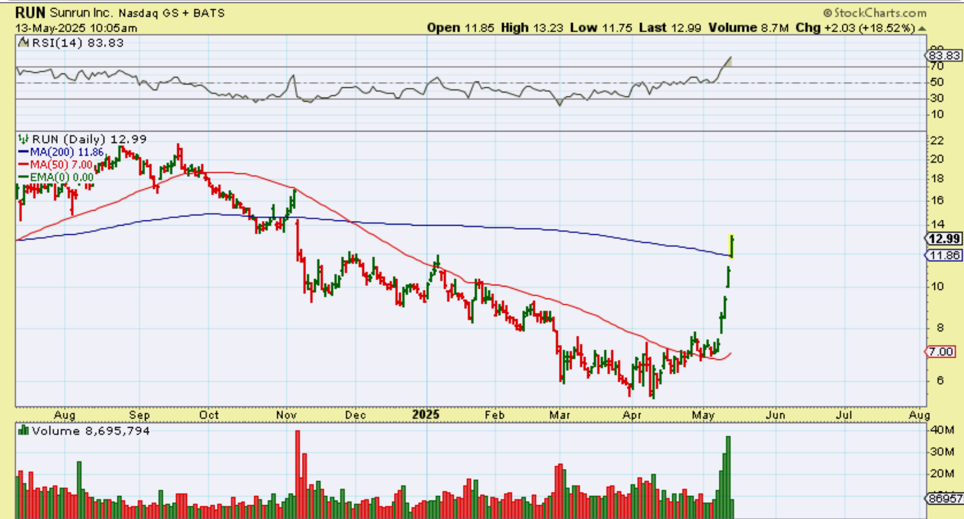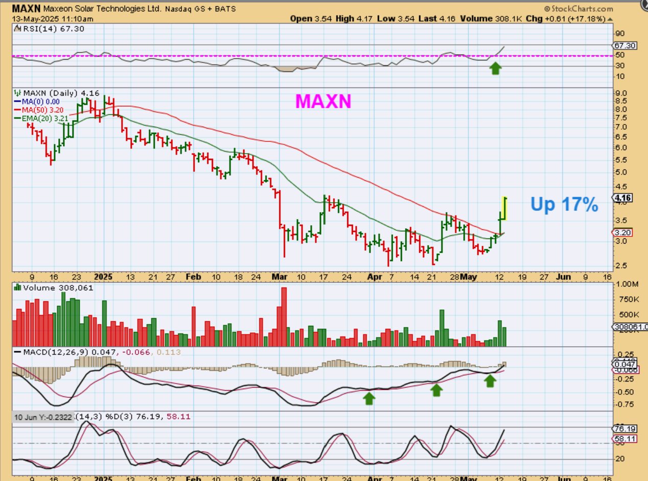 MAXN was up 17% by 11 a.m. & closed up 20%. VERY NICE. Is this going to run like RUN above did? We don’t know , but FSLR, RUN, etc have moved well off of the lows, so you can buy their dips and try to ride these rips.