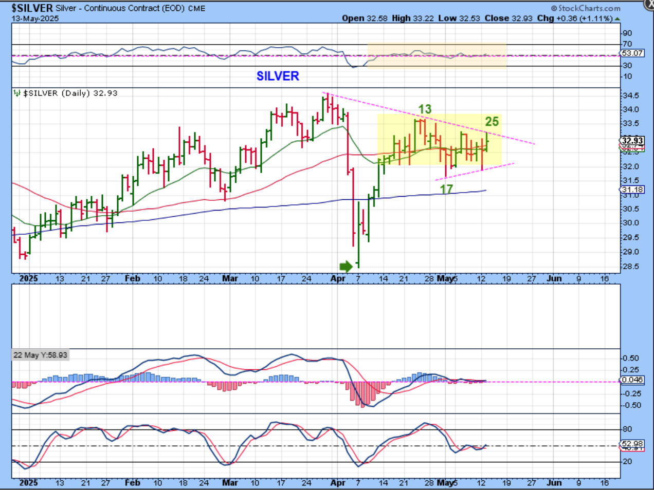 SILVER is churning along the 50sma and is possibly now forming a triangle? Silver is on day 25.