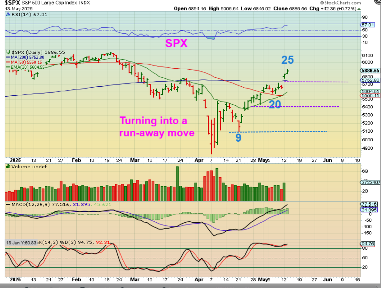 SPX – The bulls are running, and we are seeing it flow into many of the stocks that I have on my ( & you have on your) watchlists. This is day 25 of maybe 35-40+. The bulls can stretch a run out of a low, due to shorts covering at first and buyers stepping in now.