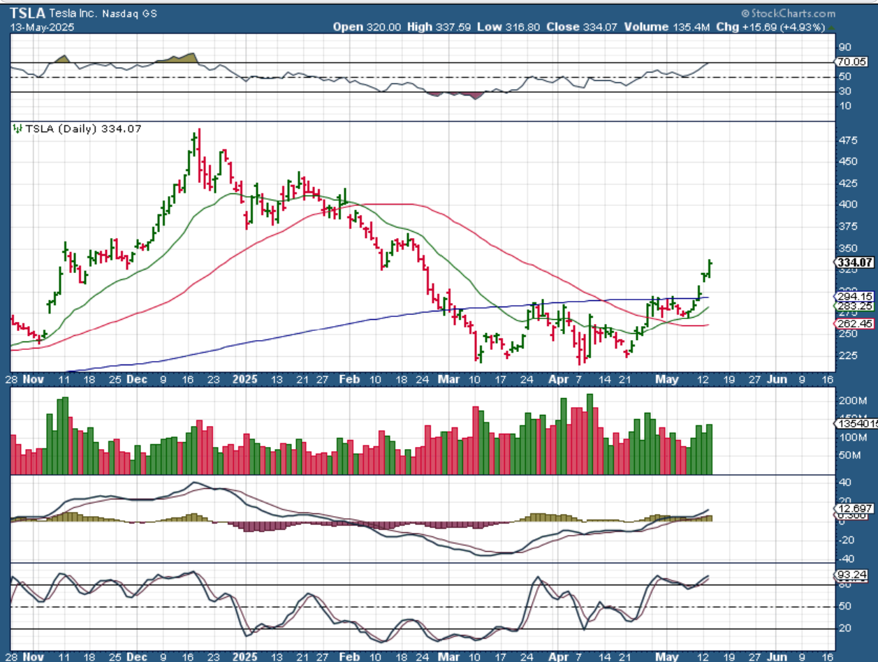 TSLA is starting to break free from the base/ consolidation. The low of $225 to the highs of $475 is 100% gains. I know that Tesla has been the target of hate and vandalism, but the charts say that they are ion their way higher. I actually trade a leveraged ticker to TSLA, and that is TSLL. Beware–it is leveraged. TSLL just moved from $6.50 to $14 in 1 month.
