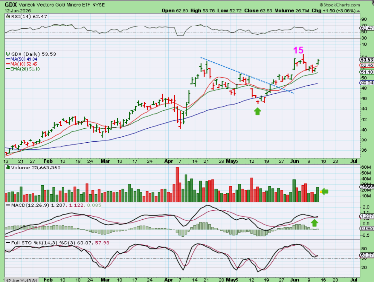 GDX moved with Gold and it is also possibly going to try to take out the day 15 peak. GDX has been following Gold.