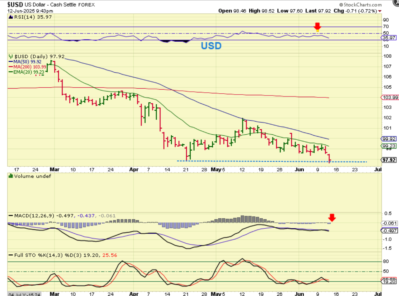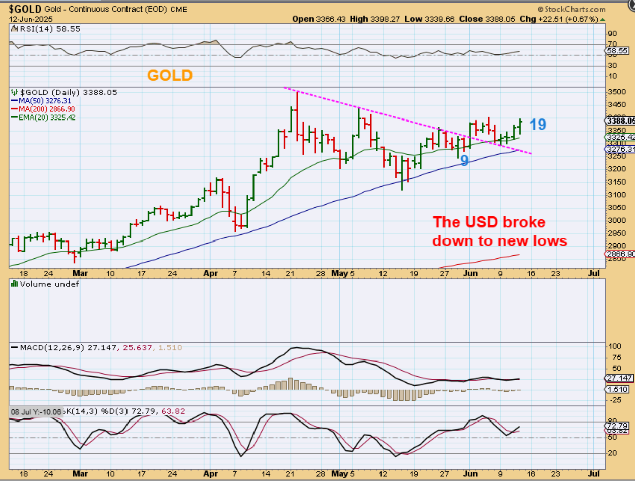 THE USD actually broke below what should have been the ICL. An announcement came out midday that Israel might attack Iran, and evacuations began to take place of various foreigners . That may have had a play in the USD weakness, but interestingly, Gold did not break that $3403 that I was looking for, even with a new low in the USD.