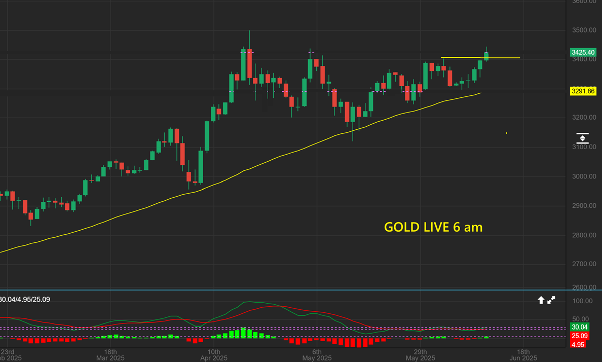 GOLD 6 a.m. – Gold did jump and then started to pull back with that news about Israel and Iran, so now the $3403 peak has been taken out and this is a R.T. daily cycle. The spike for Gold was not that big so far, but adds to the bullishness.