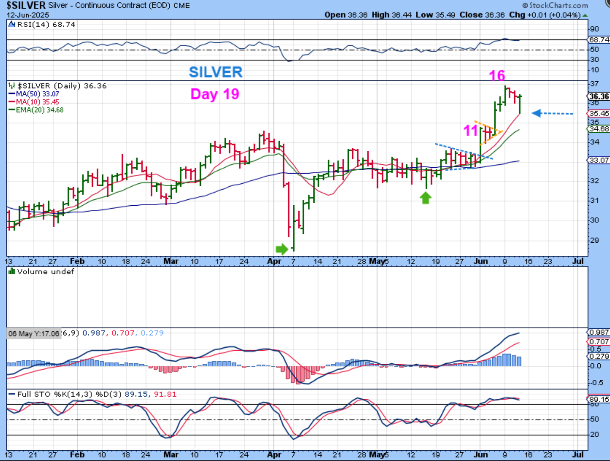 SILVER dropped and bounced off of the 10sma.  Note: Silver barely moved with the news of Israels airstrikes. Silver is actually down to $36.25 as I update this at 6:30 a.m.