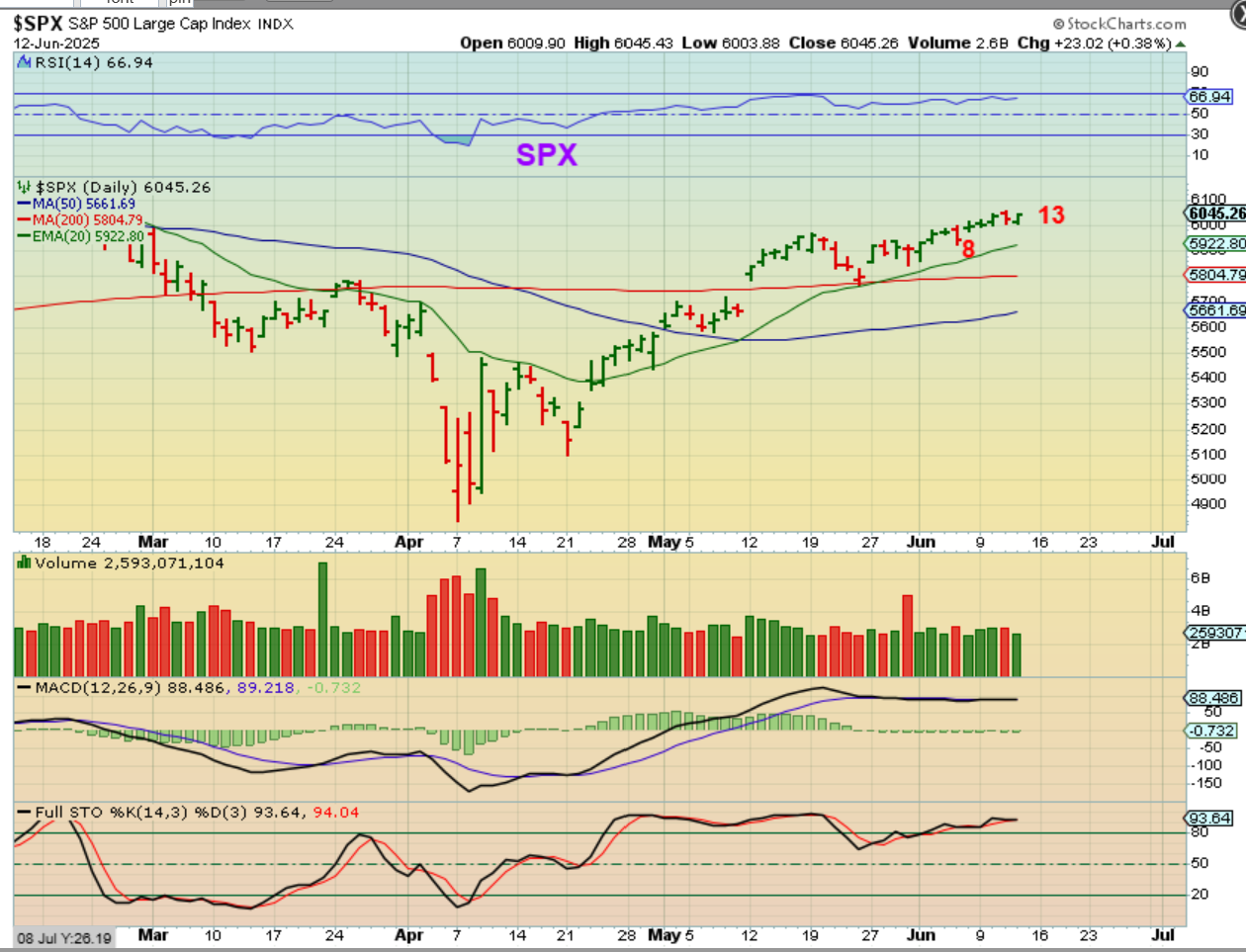Well, I am going to conclude by mentioning that we are kind of in a ‘wait and see’ mode. These set ups can lead us to believe that we will see one thing, like possibly a half cycle low temporary dip in the general markets, but over time it can become something else. Why? Well it is like the war that broke out between Russia and The Ukraine, for example: It is harder to know the long term affects, especially since we don’t know if the war will start to escalate as Iran retaliates(?) or is this a temporary move to try to disable nuclear capability and then thing subside? We don’t know. When the war between Russia and the Ukraine broke out, I dont think that anyone knew that it would still be taking place. It also no longer really affects the markets in the U.S. very much. So…