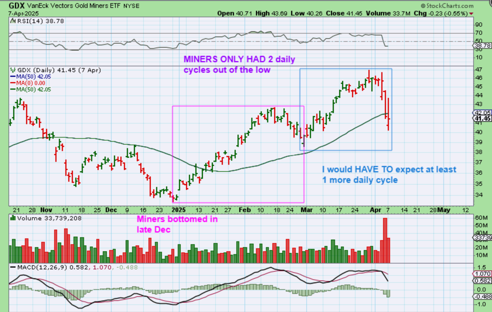 GDX bottomed at almost the last day of December (Just like Gold in that triangle seen above). That was the last low of the triangle. It had one very long daily cycle that lasted 40 days. With that April drop, we would only have GDX on its second daily cycle and also very R.T. GDX broke and recovered the 50sma, but it didn’t break the lows like Silver at all…