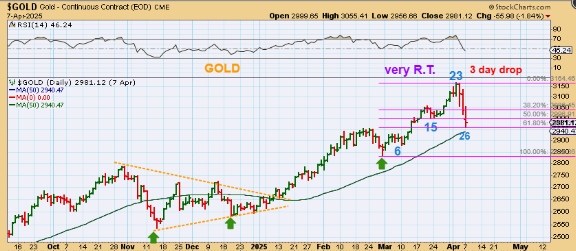 GOLD REAL TIME IN APRIL – Gold was very Right translated with a day 23 high and when the markets (& Silver) crashed, Gold did not have the same kind of price destruction. Gold did drop roughly 50% to 61%, but it only looked like a back test of the February highs and notice that Gold never even reached the 50sma. I thought that we might get a bounce and drop to give us the normal A-B-C down, but…