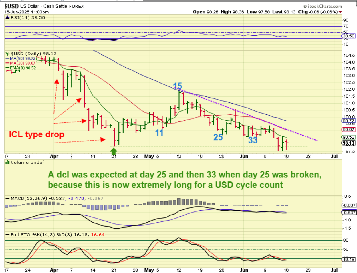 If it continues lower?… Then the USD may have some serious problems by failing on the second daily cycle after that May ICL. This does make sense, because GOLD & SILVER look ready to continue higher.