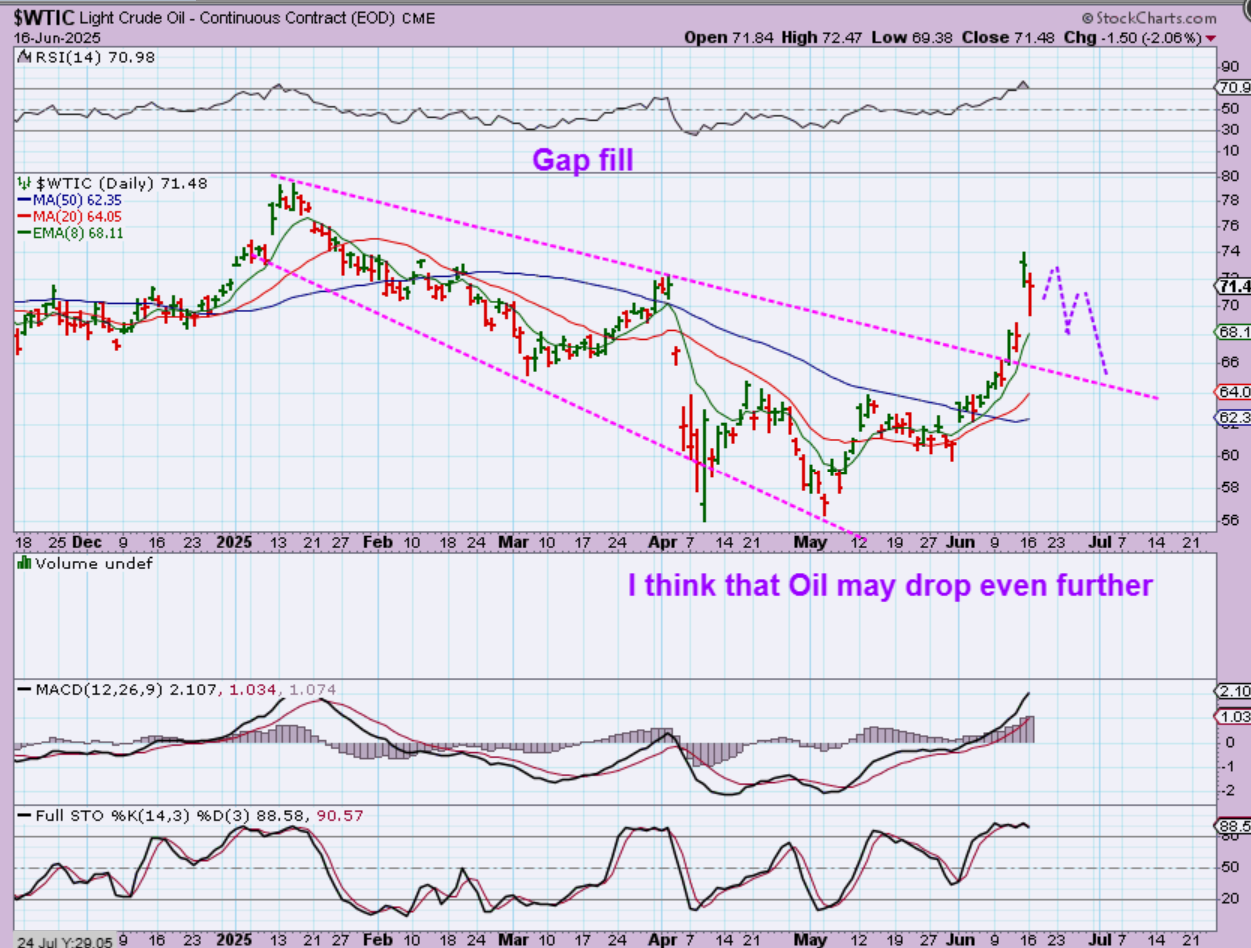 WTIC – We saw Oil gap up 10% with that news and on Monday Oil dropped lower and then started to bounce back. Oil closed down 2% and it could start to sell off lower as shown, even back-testing the trendline that it broke through, or…