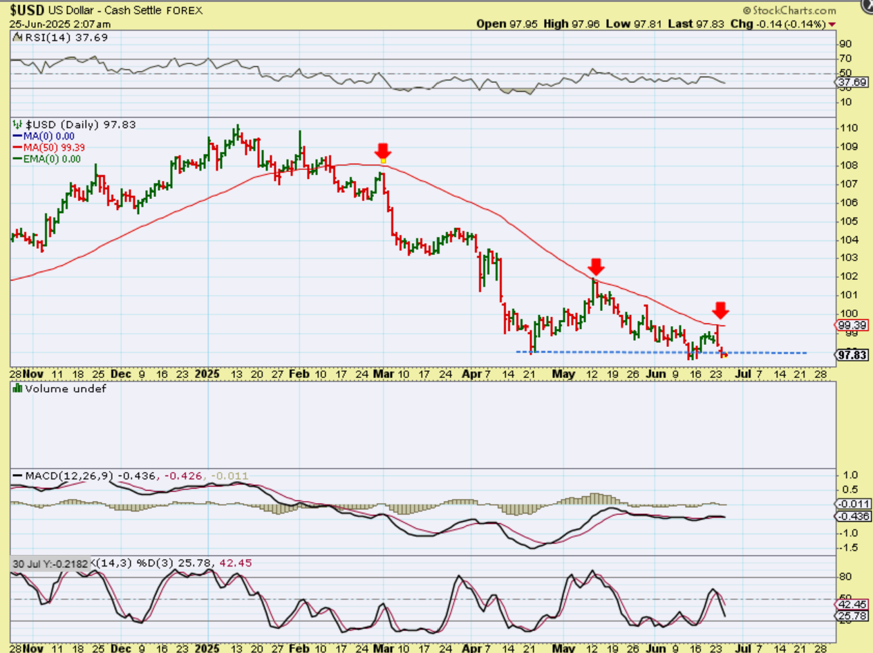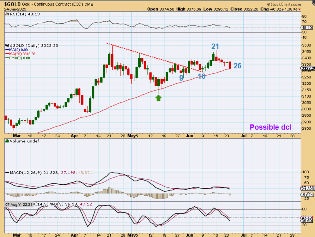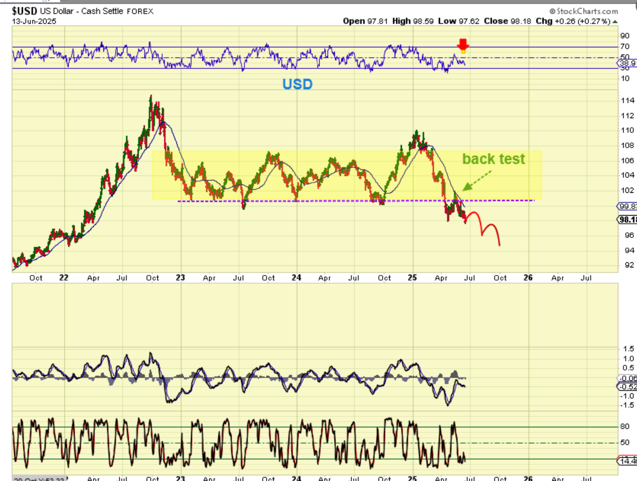 THE USD is now actually back at the lows, and it could break down, as mentioned in past reports when I used THIS chart from June 13th. It seems that this would help Gold and Silver.