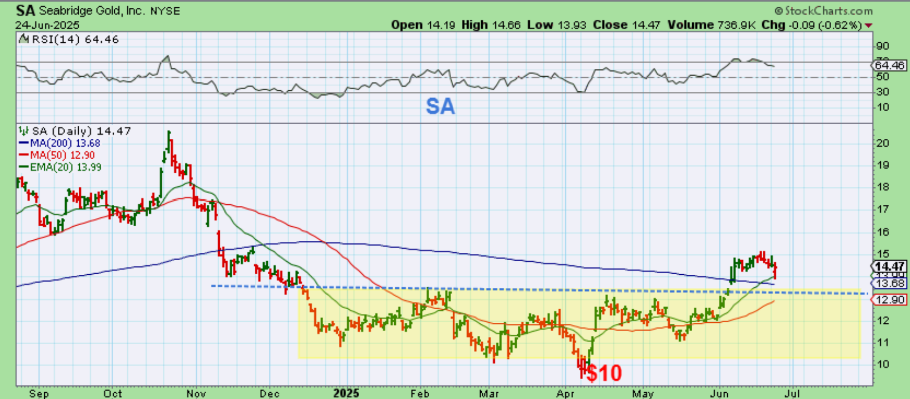 SA – not long ago I pointed out the base with SA and mentioned that it looked ready to play catch up with Gold too. It rallied from $11 to $15 last month and is chopping sideways & pulling back to support now. It could be a nice place to add or buy in this area.