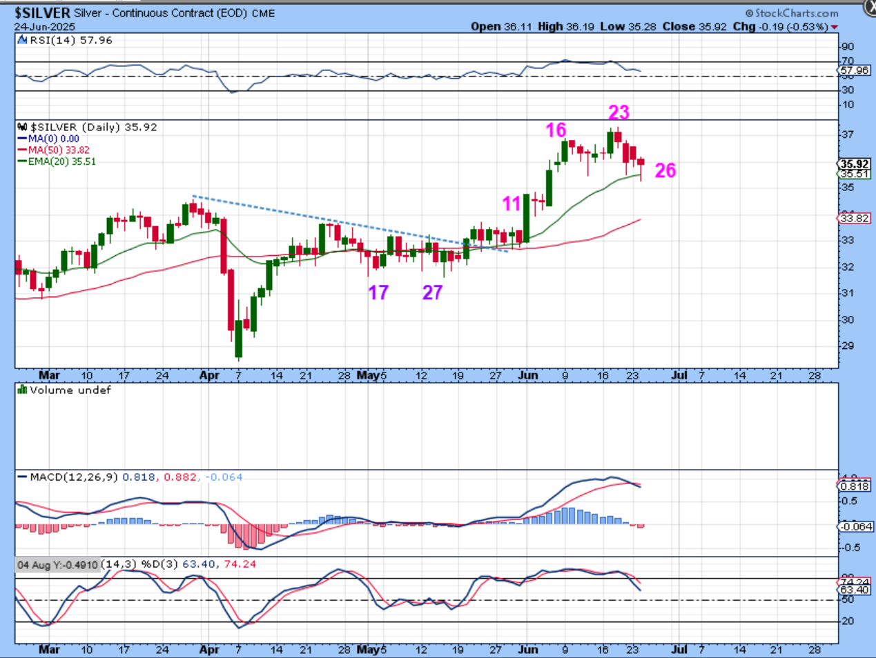 SILVER also reversed at the 20 ema on day 26. You can see that we also did that 2 days ago, so this kind of choppy price action could continue until buyers step in full force.