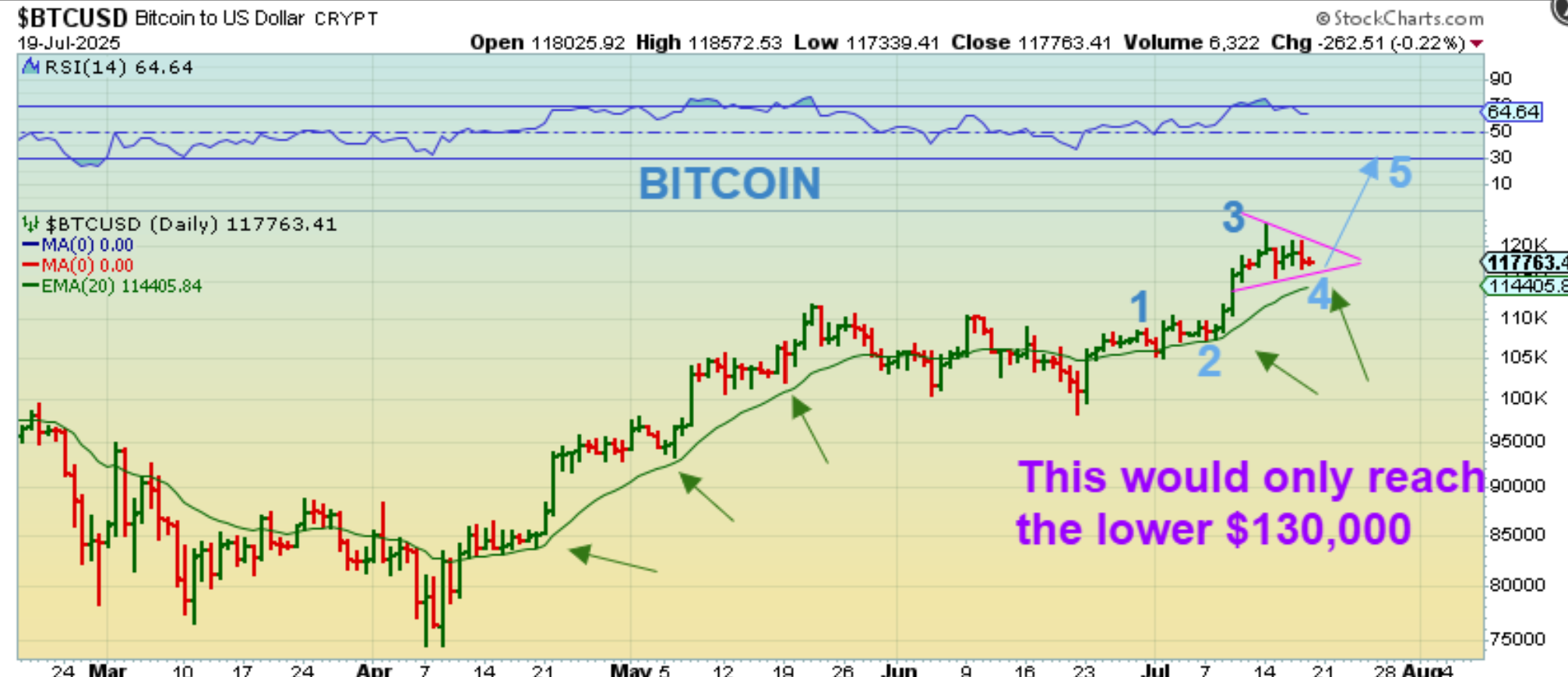 BITCOIN : If we draw a 5 wave up and measure from 2-3 as the length for 4-5, we would go from the current $117,000 area to $130,000 – $135,000 (which was my original second target). Bitcoin is almost at the 20 ema and I think that we DO have time for the next leg up in this daily cycle.  Cryptostocks have been moving higher, and I cover those in the daily reports.