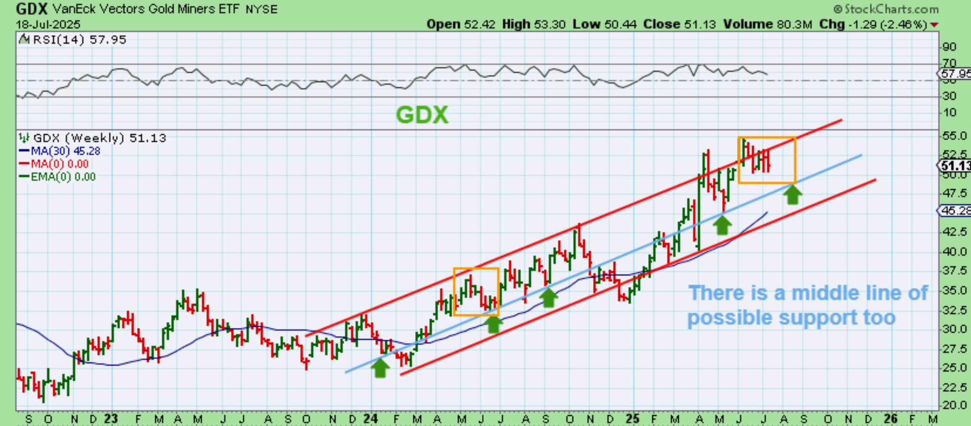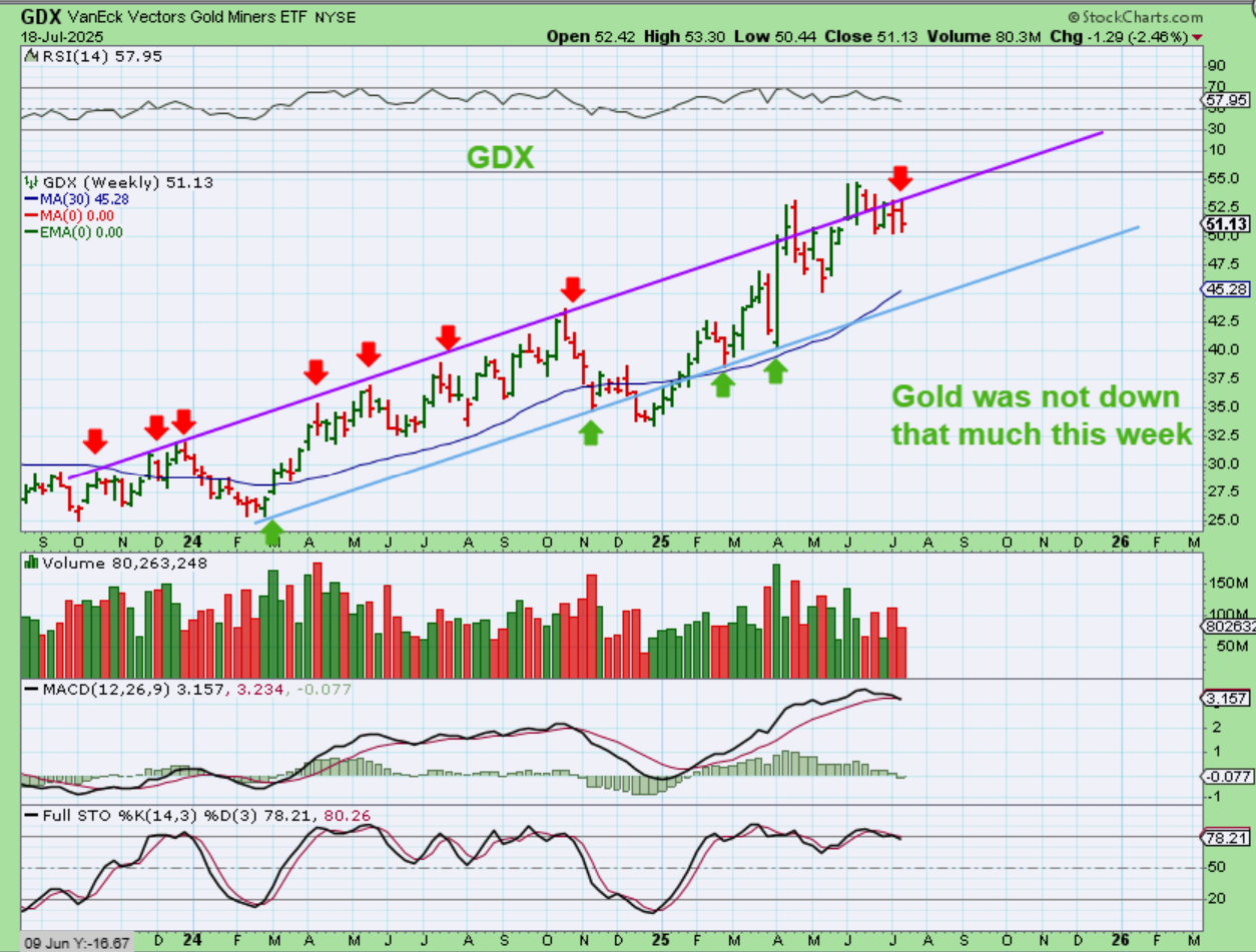This is my chart from July 3 showing why the GDX struggles at times. Some resistance has been strong, but going forward resistance above $55 is pretty much nonexistent.