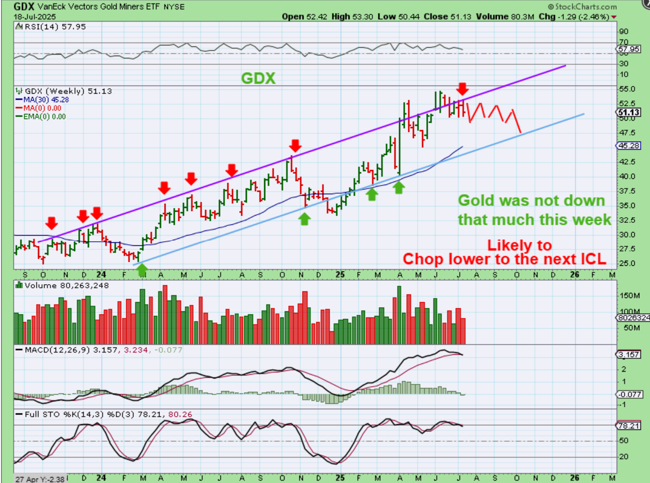 GDX WEEKLY– I was showing this channel for quite some time and the thinking was that Miners may breakout and run, then back test it, and run again. For now we have a couple of false breakouts and the choppy price action has taken us back inside of that channel. In technical analysis, you usually chop sideways or even revisit the lower channel from here. I’ll draw that for you…
