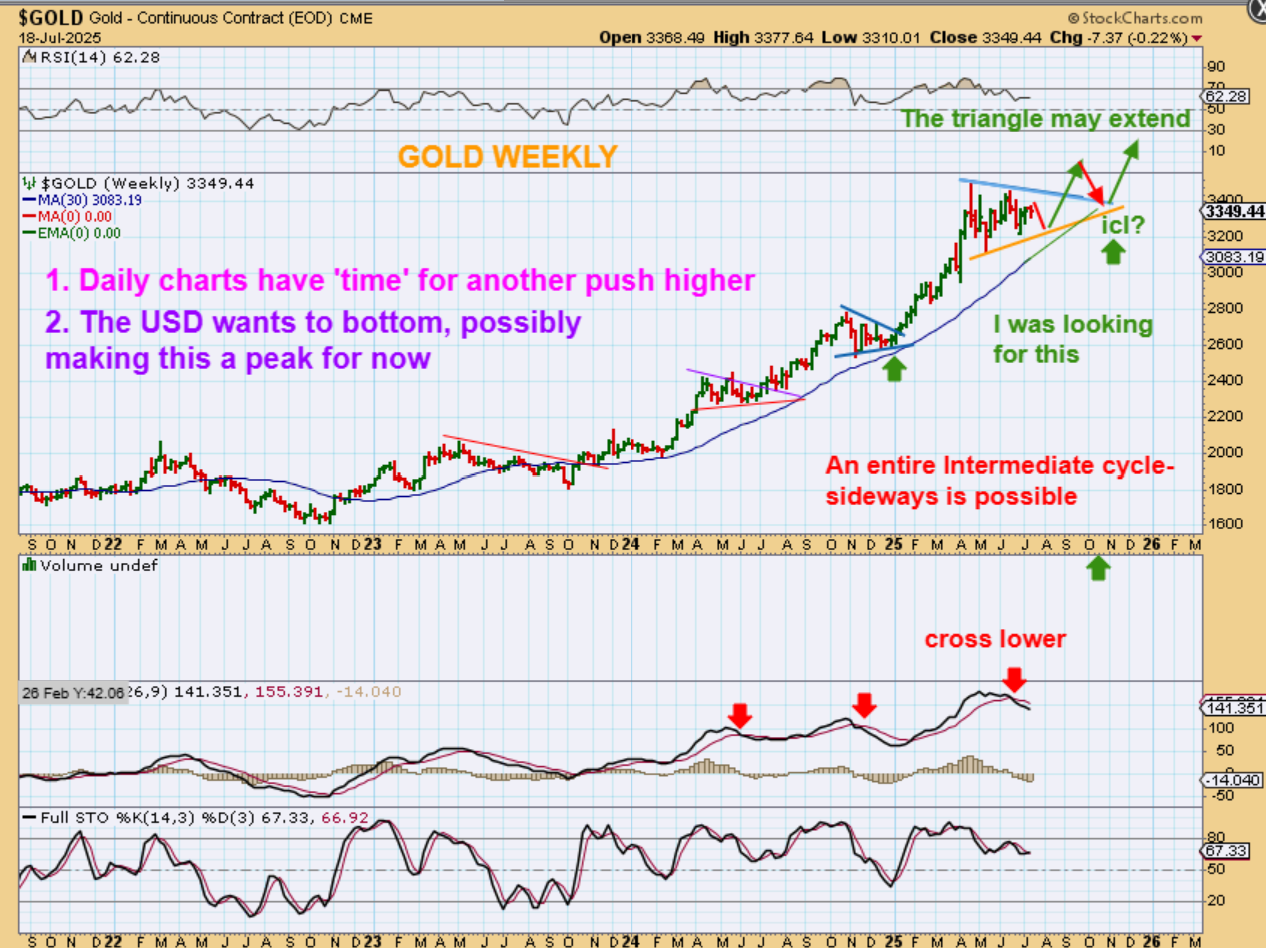 This chart is also saying that Gold may continue to consolidate. By chopping sideways even longer, the frothy Bullish sentiment dies down, investors get frustrated, and this triangle can continue to develop as it extends price over to the blue 30 week ma.  Normal bull price action.