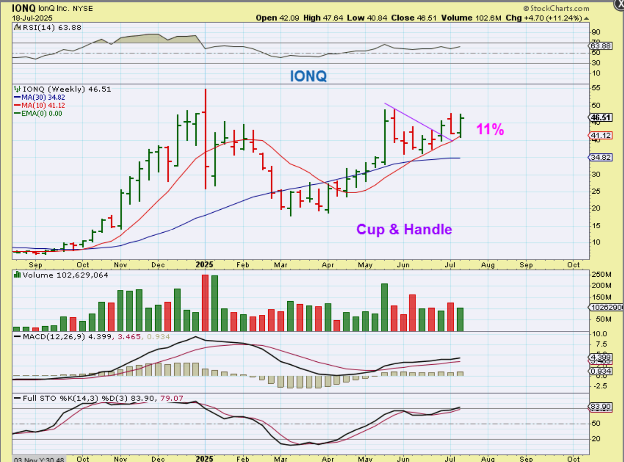 IONQ was ‘only’ up 11% this week, and we had that in the reports over the past couple of weeks. Look at that red 10 week ma. Price is bullishly climbing it too. I’ve also covered QBTS, QUBT, and ARQQ.  QMCO has been a real lagger in this sector, but I’ll keep looking for signs of life there as time goes by.