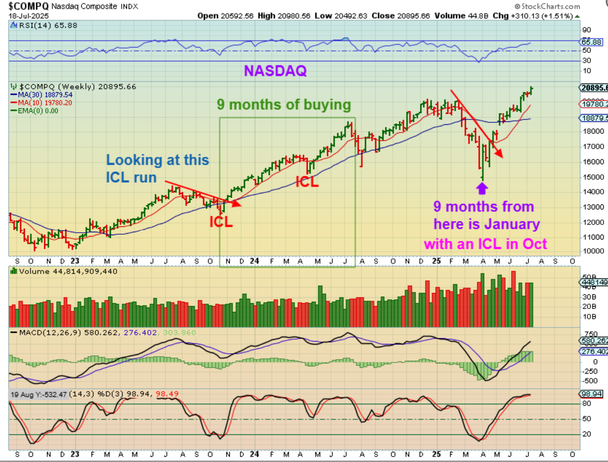 With that in mind, The NASDAQ shows us that it rallied ICL to ICL for 6 months and then added another 3 months of buying after that ICL, so we saw 9 months of gains with only 1 sharp deeper dip (ICL). 9 months from our April ICL would carry us to October(ish) ICL and then on into January. 2025 would begin with a crash and then rally into year end.  So far the gains have been tremendous on individual stocks and others will play catch up, so THAT is why I wanted to bring this to your attention. This rally mode can continue higher..