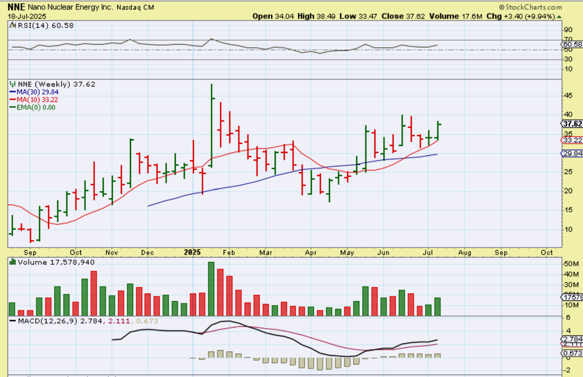 NNE is the lagger, but it did pop up 10% last week, so this may be ready to go even higher. I like the volume on up weeks and a weekly MACD Cross with RSI at 60 is bullish. NOTE:  You can see that the normal ‘chop’ here has been roughly $30 to $40 to $30, so these are not easy ‘buy and hold’, but the weekly charts do remain bullish. NNE reversed at the 10 week ma 3 weeks in a row.