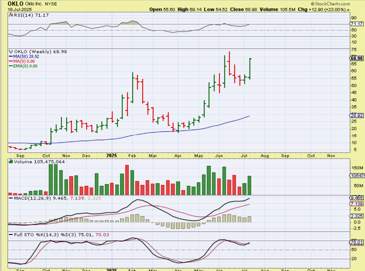 OKLO has been incredible, but I missed the first part of that run from April to June. I did discuss the recent dip and it surged 23% this week. What a bullish week the general markets had. Can this run higher? IT ran for 9 or 10 weeks out of that April low, so this current 2 week run should not be the ‘peak’.