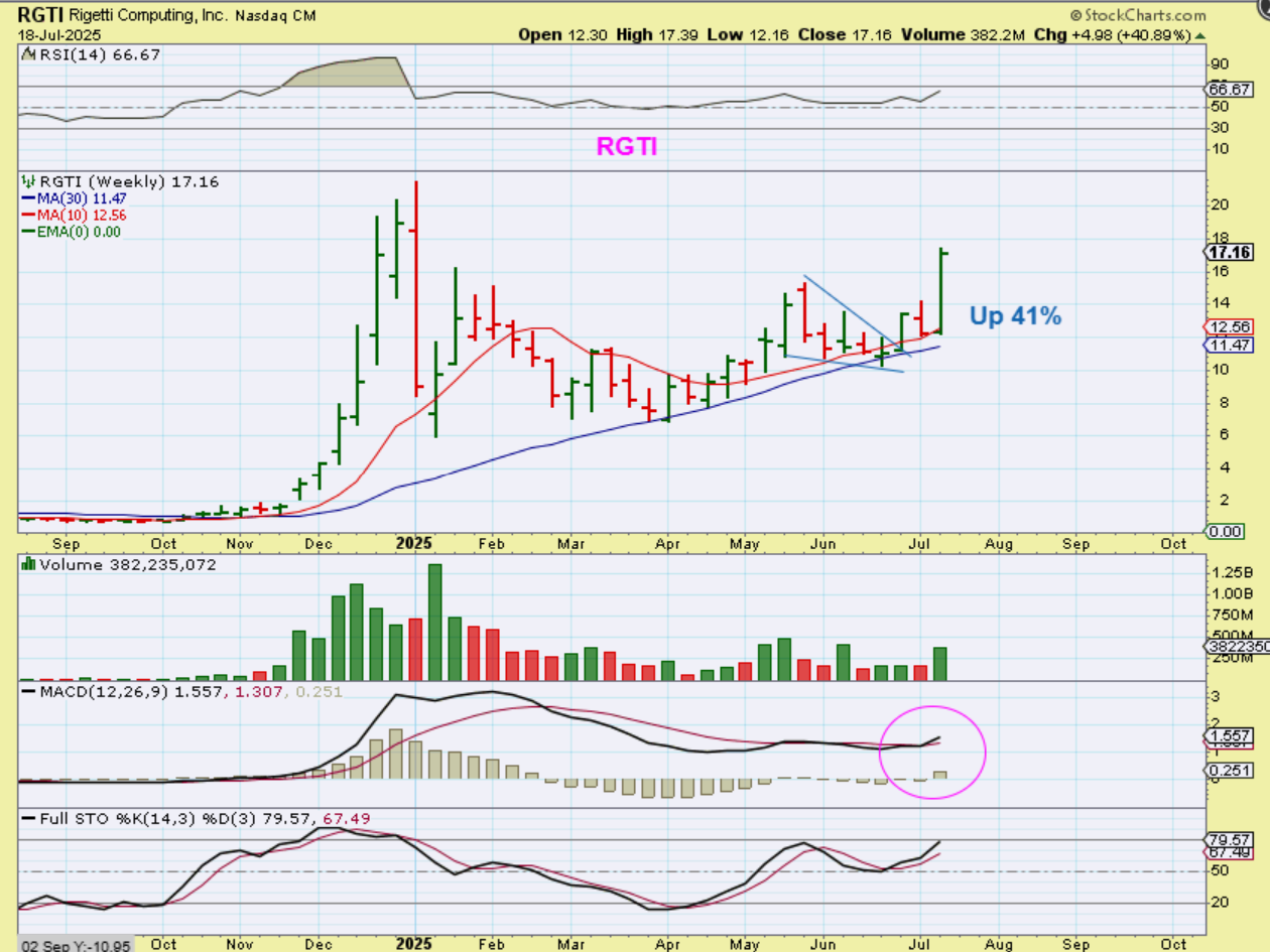 RGTI – Who knew that it would pop 41% this week alone? When you look at RGTI with technical analysis though, it rode up both the 10 week ma and the 30 week ma, and that is normal and bullish price action, so the buy was near $10 & $11