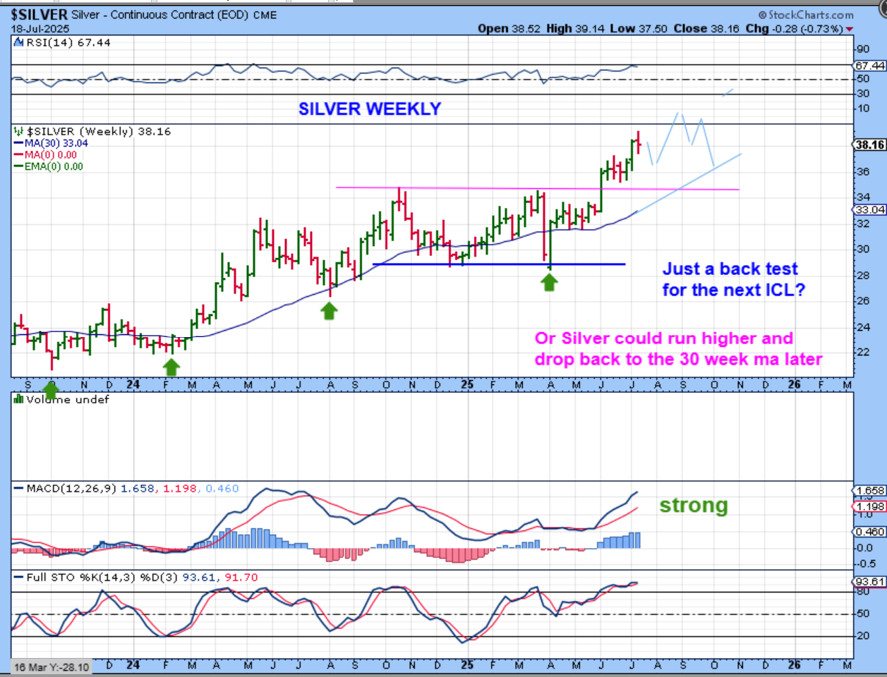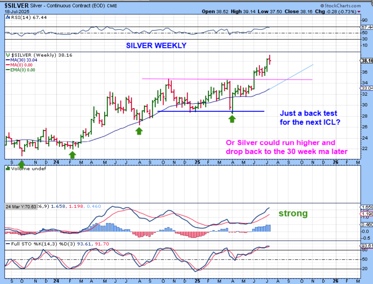 So Silver could still move higher, but with Silver stocks selling off, I think that it might start to dip into a dcl, bounce again, and then drop into the 30 week ma over time too. More sideways chop, like Gold.