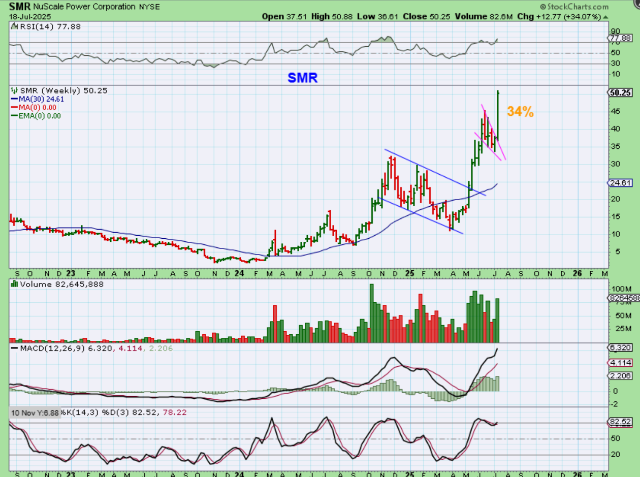 SMR shot up 34% this week, and unfortunately I had sold mine in that bullish descending wedge! The chop was big and the drop was $45 to $35, so I stepped out for a bit to buy other set ups like OPTT, WWR, SERV, SOUN, etc, but congrats to any that held on!