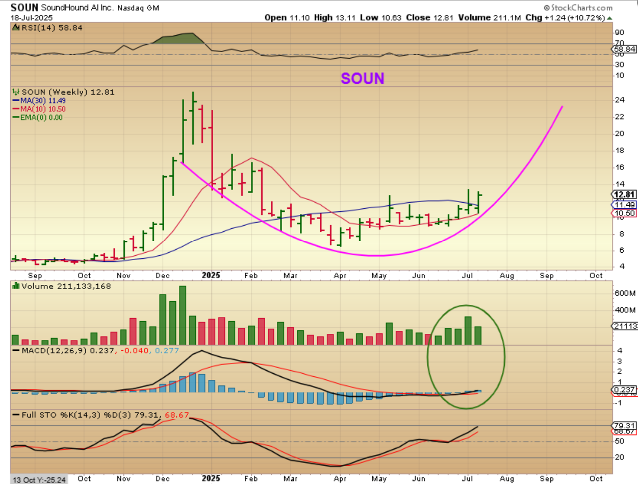 SOUN WEEKLY – I wanted to show you the weekly chart so that you can see the potential over time. This is a beautifully bullish set up at this point. This can do as BBAI did, by running up to former highs or more. That’s a $10 to $24+ run over time