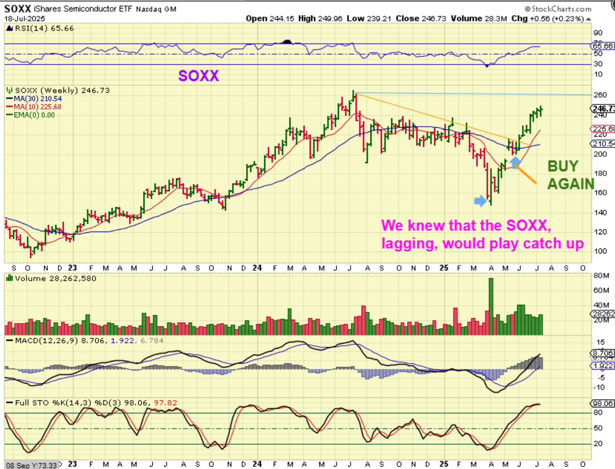 I had pointed out that The SOXX was lagging a while back, so we had a couple of buy opportunities then and now we see 8 straight weeks of gains. Stocks like AMD, MU, SOXL, etc  made some nice gains too.
