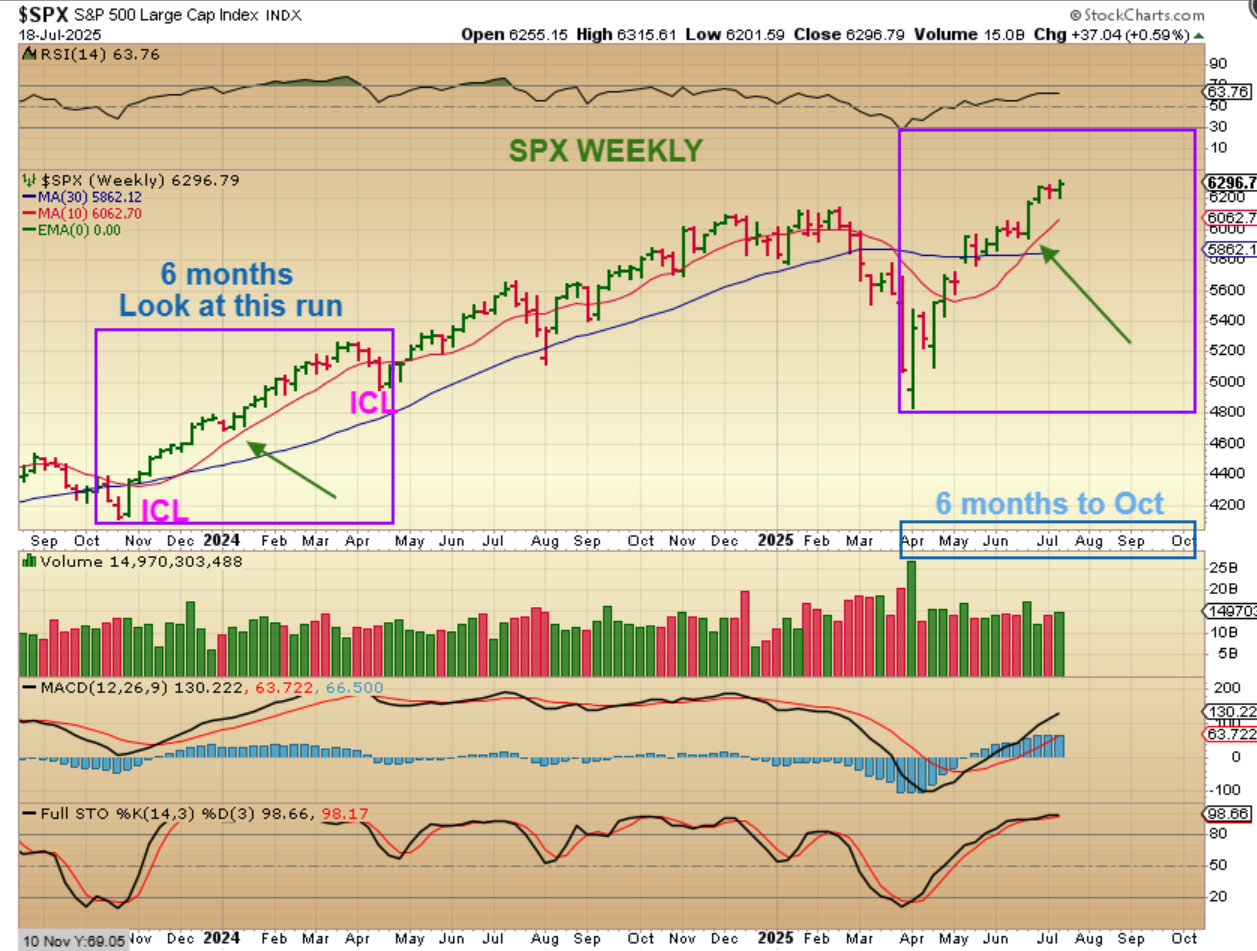 I want us to look at The SPX rally from ICL to ICL in 2023-2024 (the first purple box). You do not see daily cycle lows, since they were mild and this is a weekly chart. The dips were quickly scooped up. I’m showing this now because that is somewhat similar to this rally out of the April ICL. In 2023-2024, the first run hardly dipped for 6 months, and if we repeat that now, we’d run from April to October with minimal dips along the way.