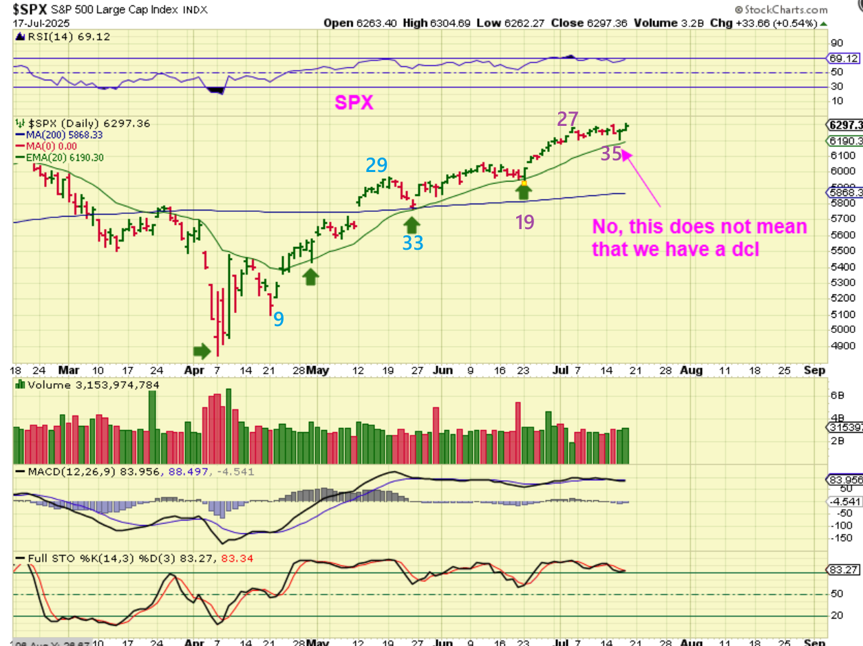 We know that the general markets are due for a dcl, but the recent dips (half cycle lows and dcl’s) have all been mild and bought up at the 20ema. See the green arrows please. Even though the last dcl was at day 33, that timing is used as a guide to look for the low, not a rule. I have also seen dcls at the 45+ area, so I said on Friday…