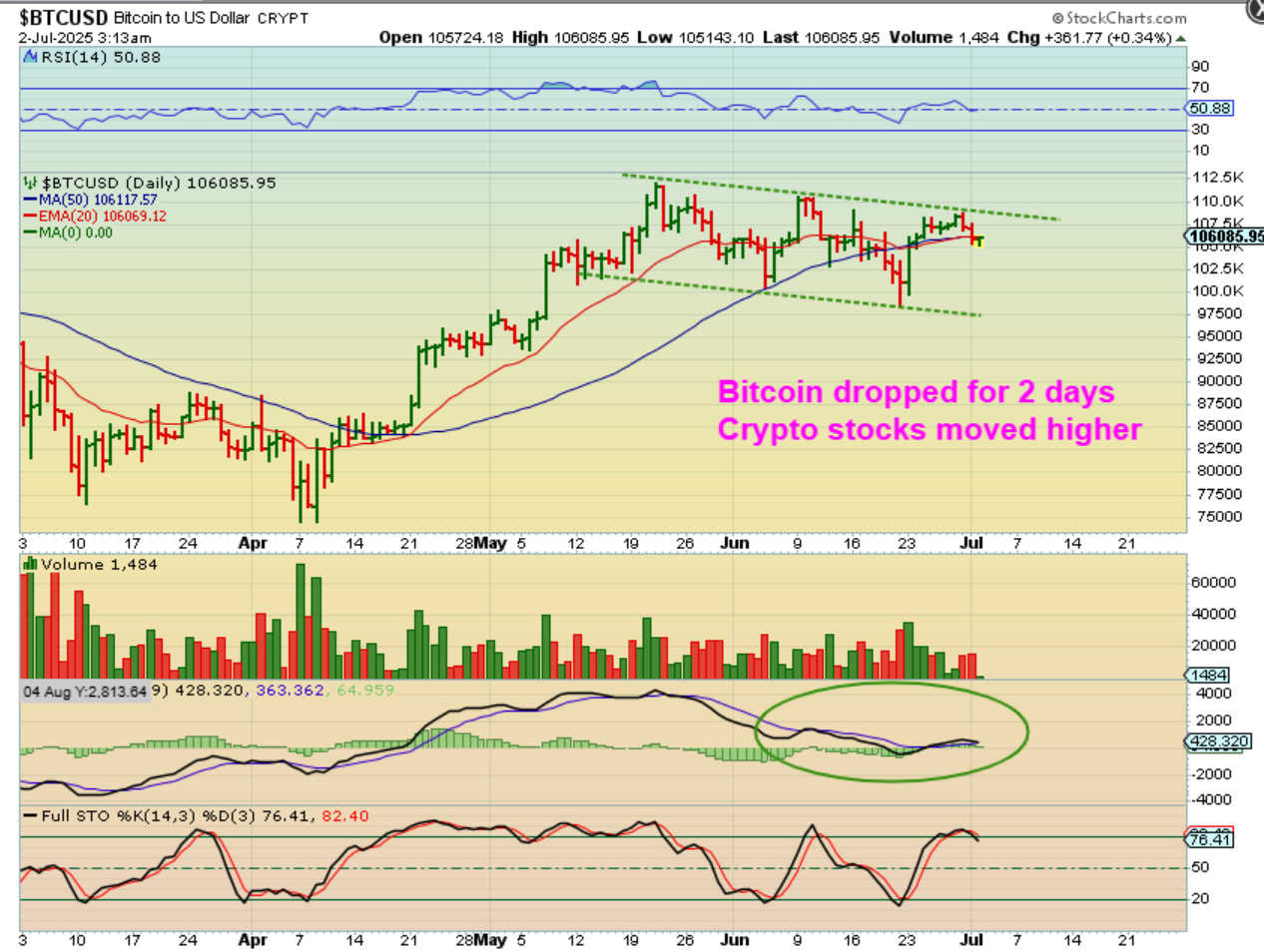 BITCOIN – If Crypto-Miners are leading, does this indicate that Bitcoin just did a shake out and this pull back may reverse early and break out? That is possible, because now this chop has allowed time for the MACD to stabilize and turn higher. As Bitcoin sold off on Monday and Tuesday, let’s look at a couple of Crypto stocks