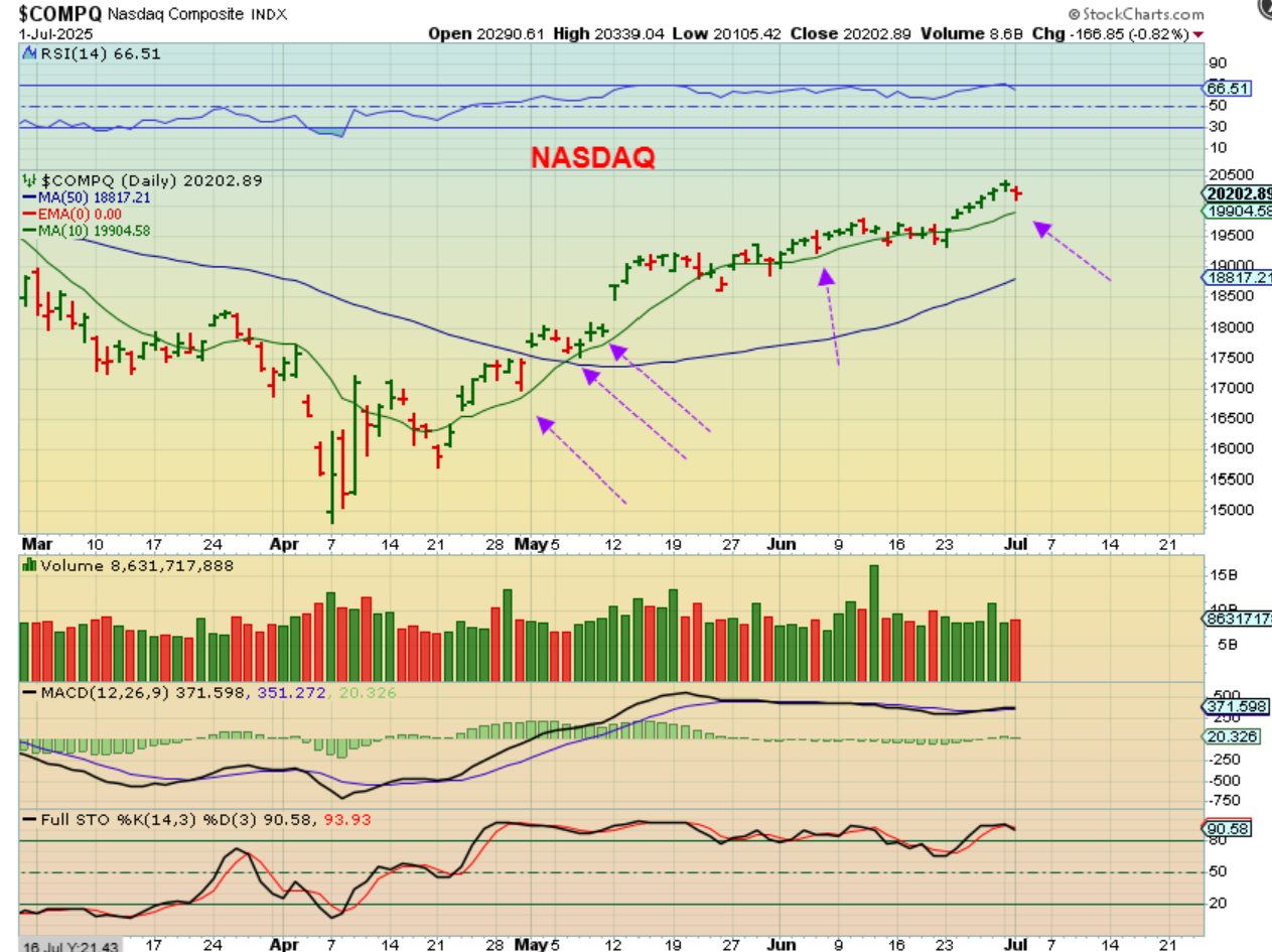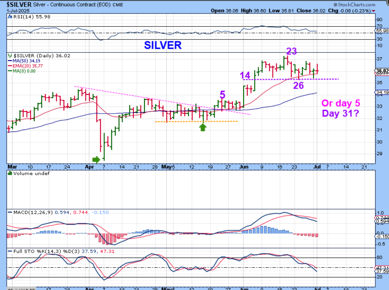 SILVER – Speaking of choppy, Silver was strong from mid-May to Mid-June, but it has been chopping sideways lately along the 20 ema, as a dcl comes due.  We might have that dcl at day 26, and if so this would be day 5.