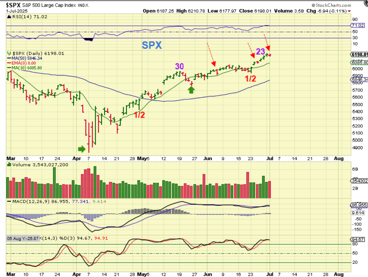 SPX – The first daily cycle peaked on day 30 and we are currently on day 24, with a day 23 peak. This can go higher, and we have also seen 1 day drops in the last run.