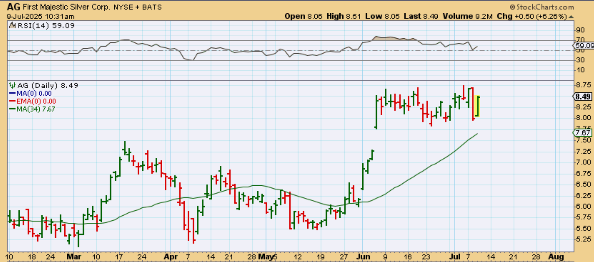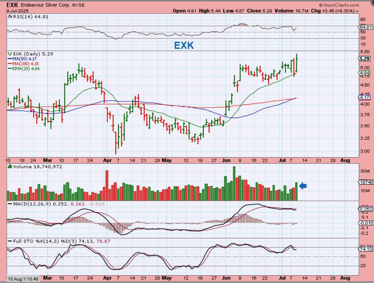 Do you remember how Monday saw EXK push to a new high, then it slammed down Tuesday? Well, EXK rallied Wednesday (while Silver was down). It held the 20 ema on a closing basis.