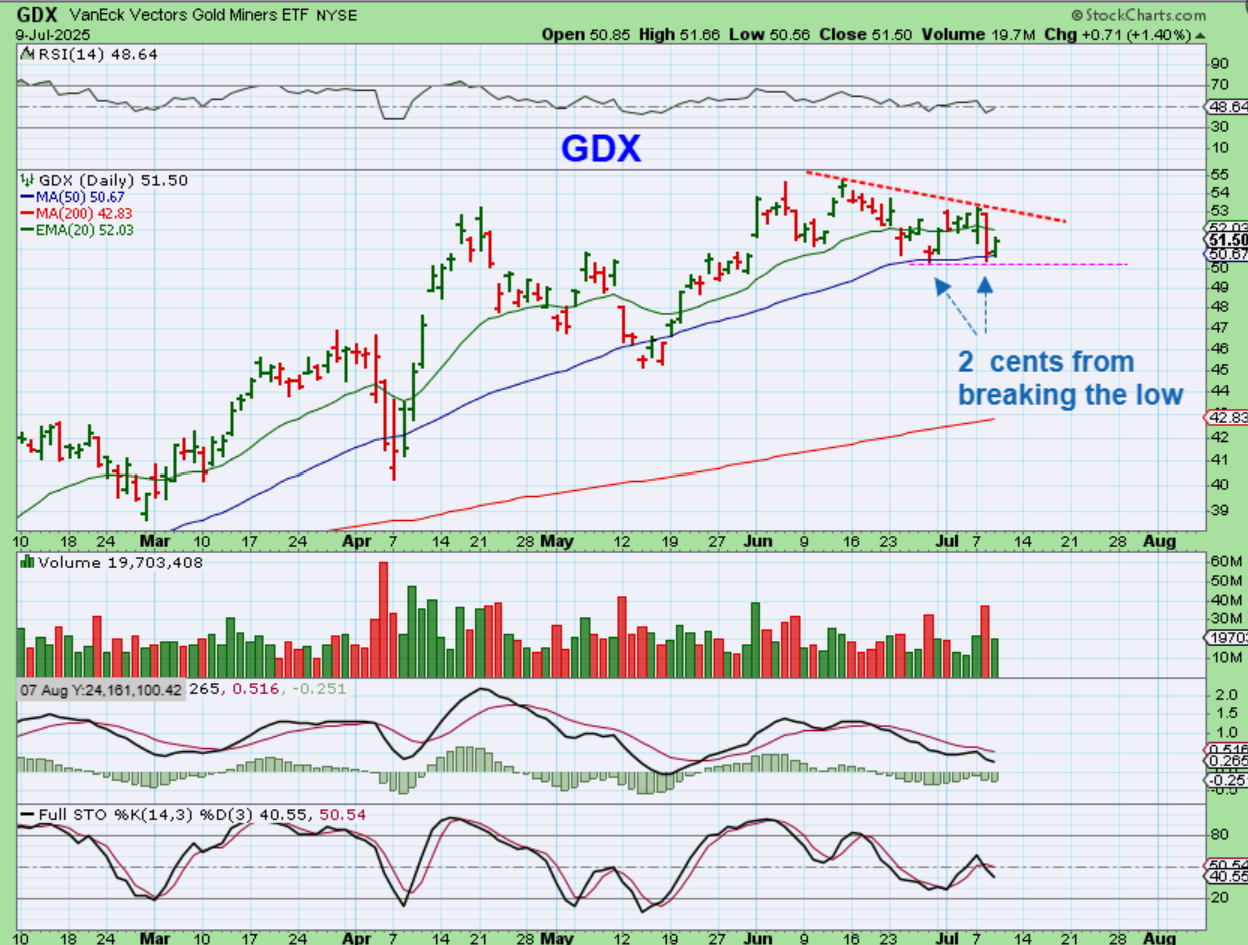 GDX also reversed higher. We really want to see a push higher through that upper trend line.