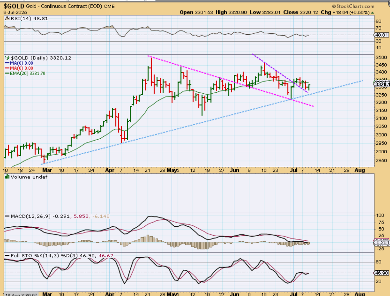 GOLD is not a ‘bad’ set up at all, but it has been choppy and it could remain a little choppy too. Notice however, that Gold is approaching the uptrend line (blue). That may be support. The chop is similar to what Bitcoin has done, but Bitcoin eventually worked its way back up to the highs again, and Gold can too. The goal is a consolidation to digest recent gains and then continue higher.