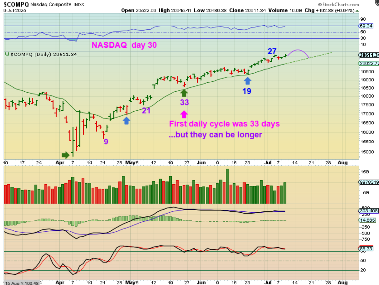 NASDAQ – The first daily cycle was 33 days long, and they often run 35-40or so in length. We are now on day 33, so we say that it can dip at any time. If the Jobless claims report pushes this higher, we may not dip until late next week (say day 40 or so). Afterall, these are bullish markets. Check out the charts of RKLB, SOFI, ENVX, NVDA, UBER, GRPN, MSFT, MU, AMD, etc etc. since the April ICL. There are many more, and AAOI, LMND, etc are starting to play catch up too.
