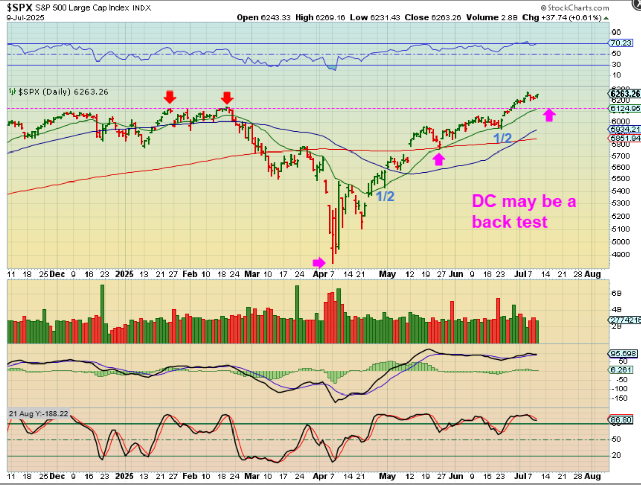 SPX – The Fed Minutes really didn’t affect the markets and the General Markets continued higher after a 2 day ‘pause’. A dcl may be mild again, only back testing the break to new all-time highs. USUALLY, we see a dcl…